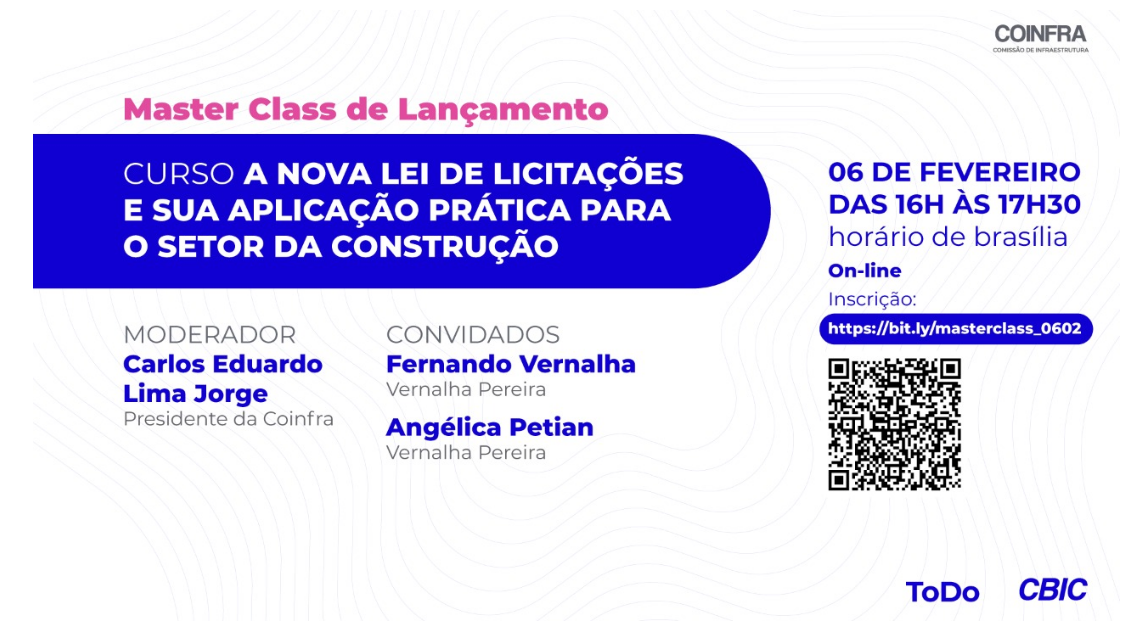 A Câmara Brasileira da Indústria da Construção realiza, no dia 06 de fevereiro, a Master Class do lançamento do curso “A Nova Lei de Licitações e sua Aplicação Prática para o Setor da Construção”. O evento é gratuito e será realizado online, com transmissão ao vivo pelo YouTube da CBIC, das 16h às 17h30, horário de Brasília.