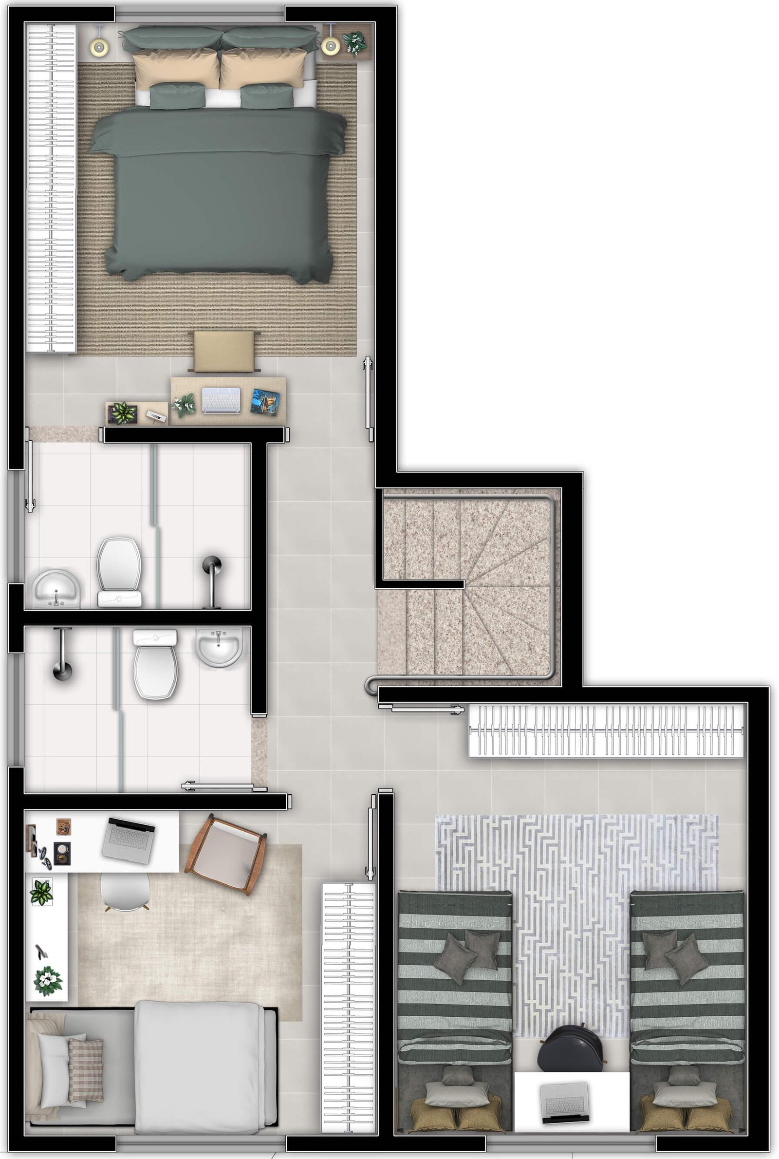 Os sobrados têm 126m2 de área construída, sendo 3 quartos (1 suite), 4 vagas