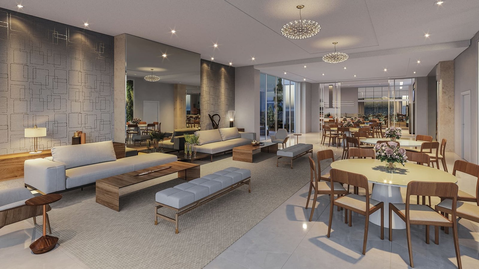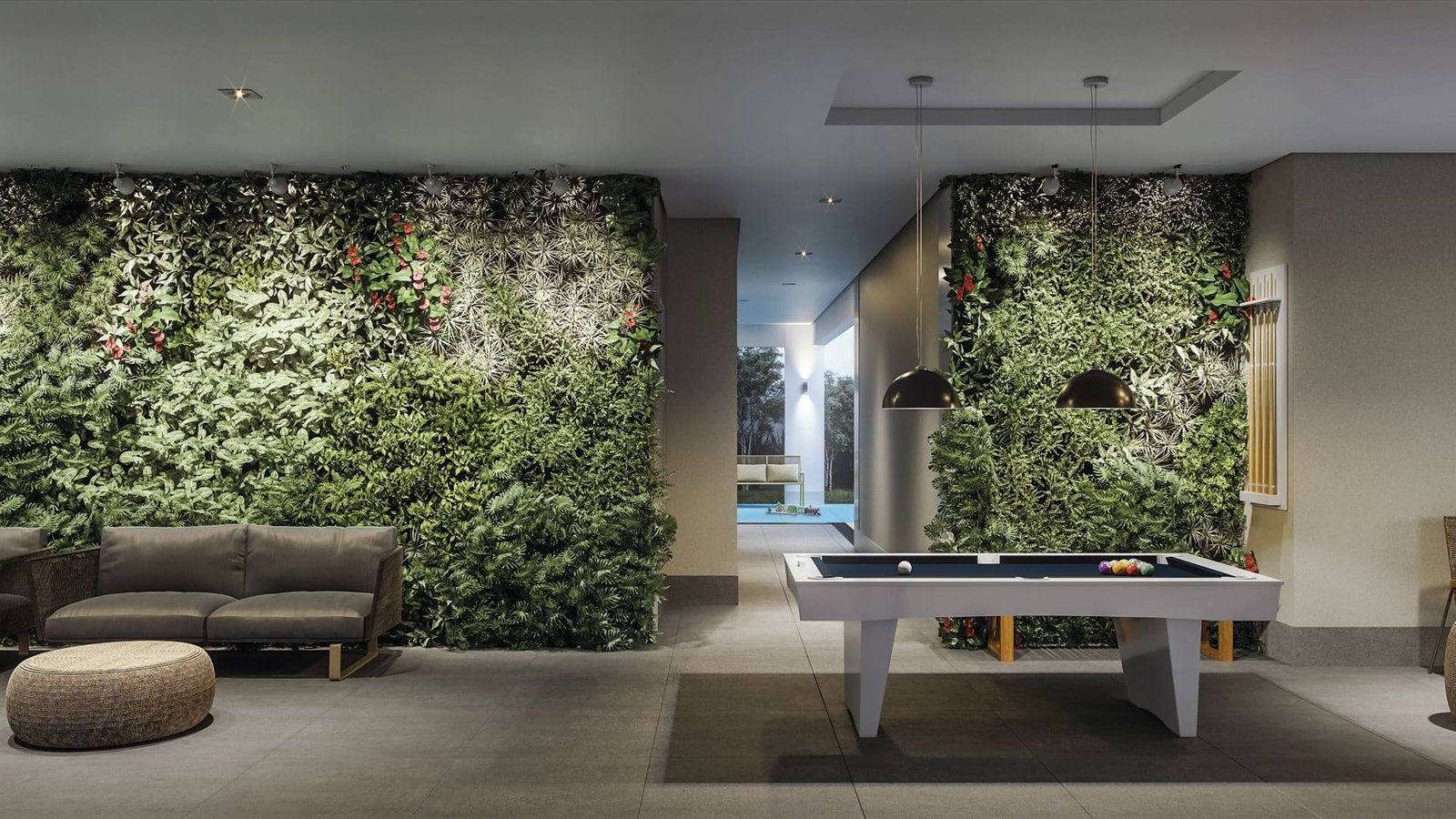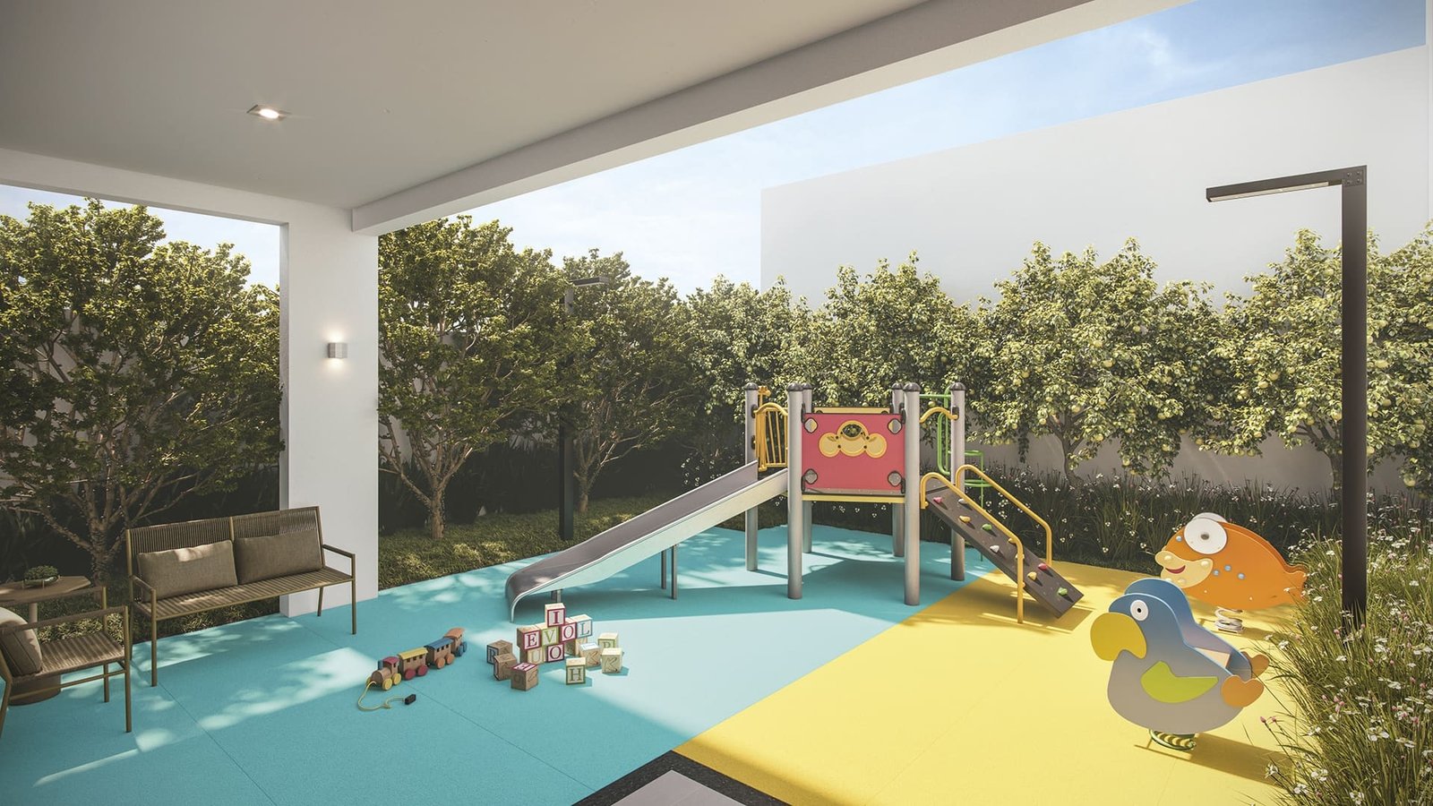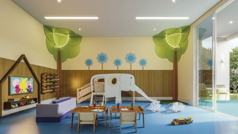 Área de lazer completa com piscina, brinquedoteca, salão de festas, salão de jogos e academia.