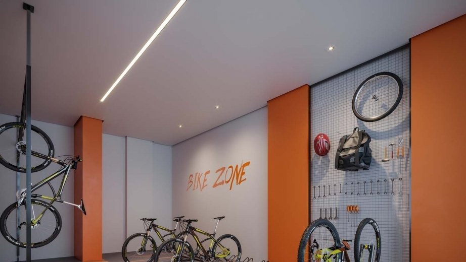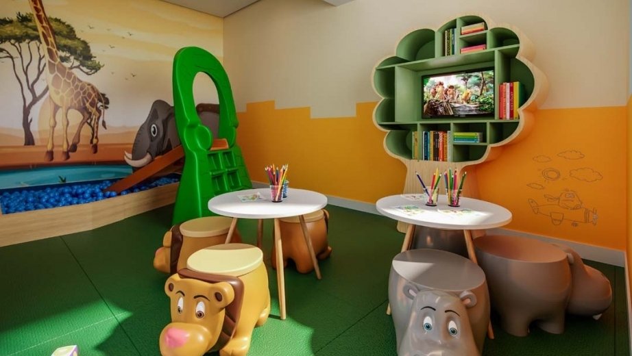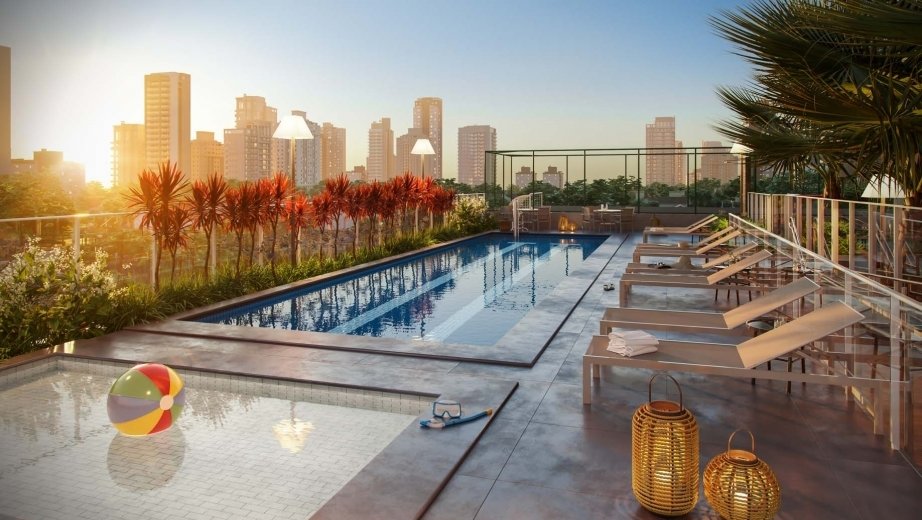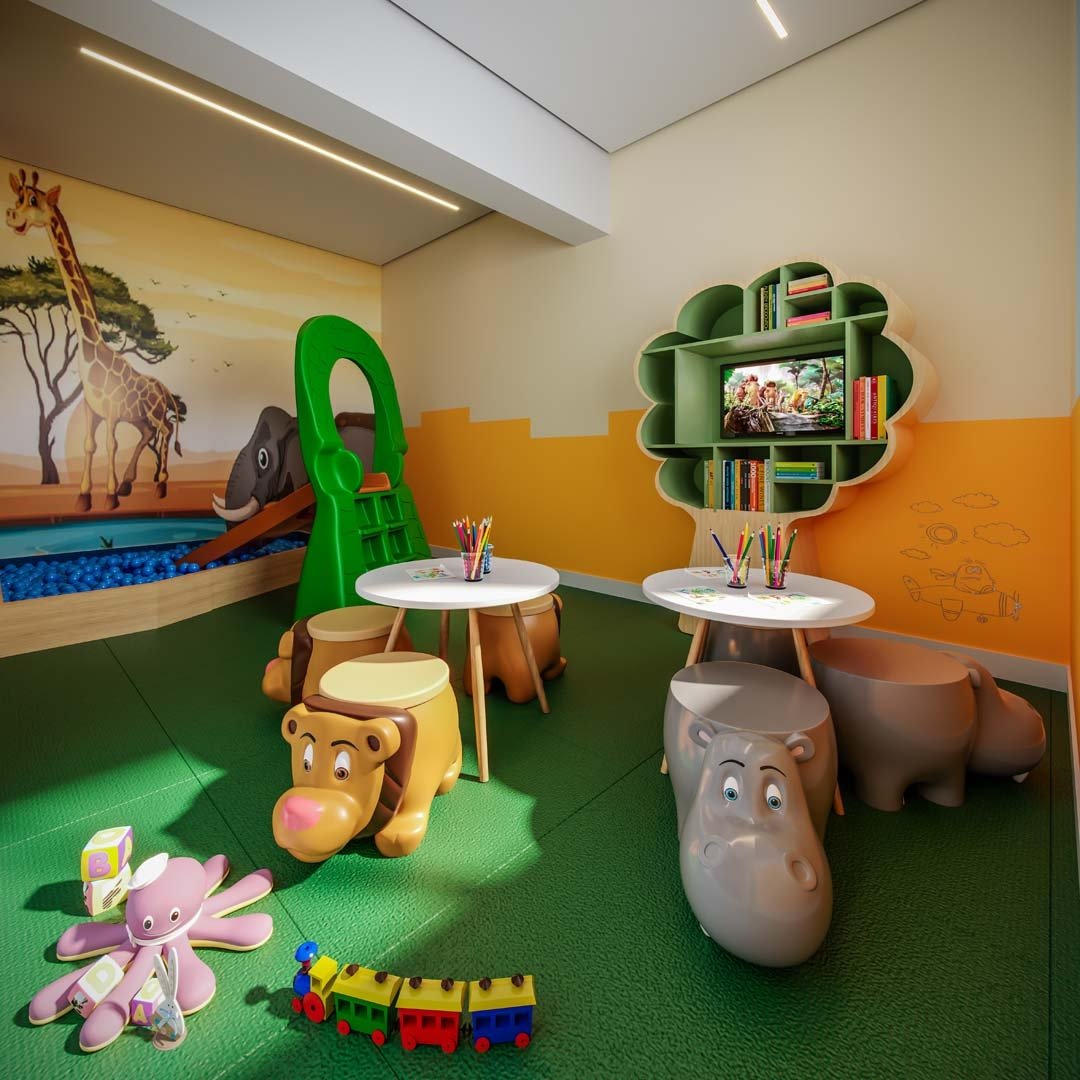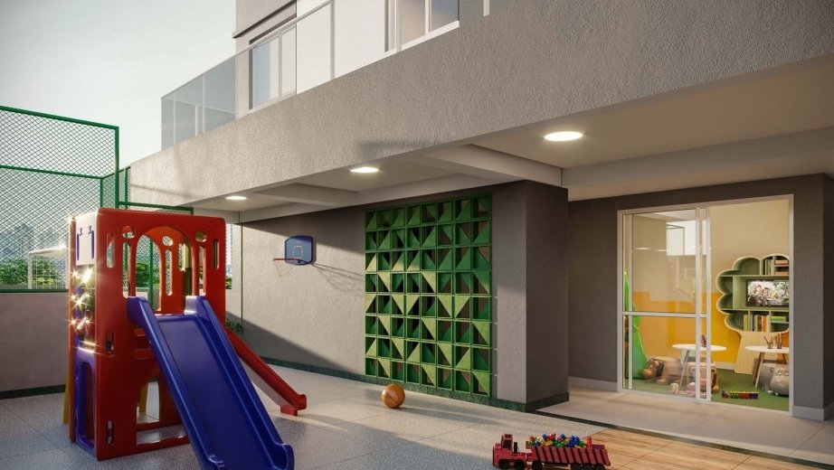 Área de lazer com piscina, brinquedoteca, espaço fitness, espaço de festas e bicicletário.