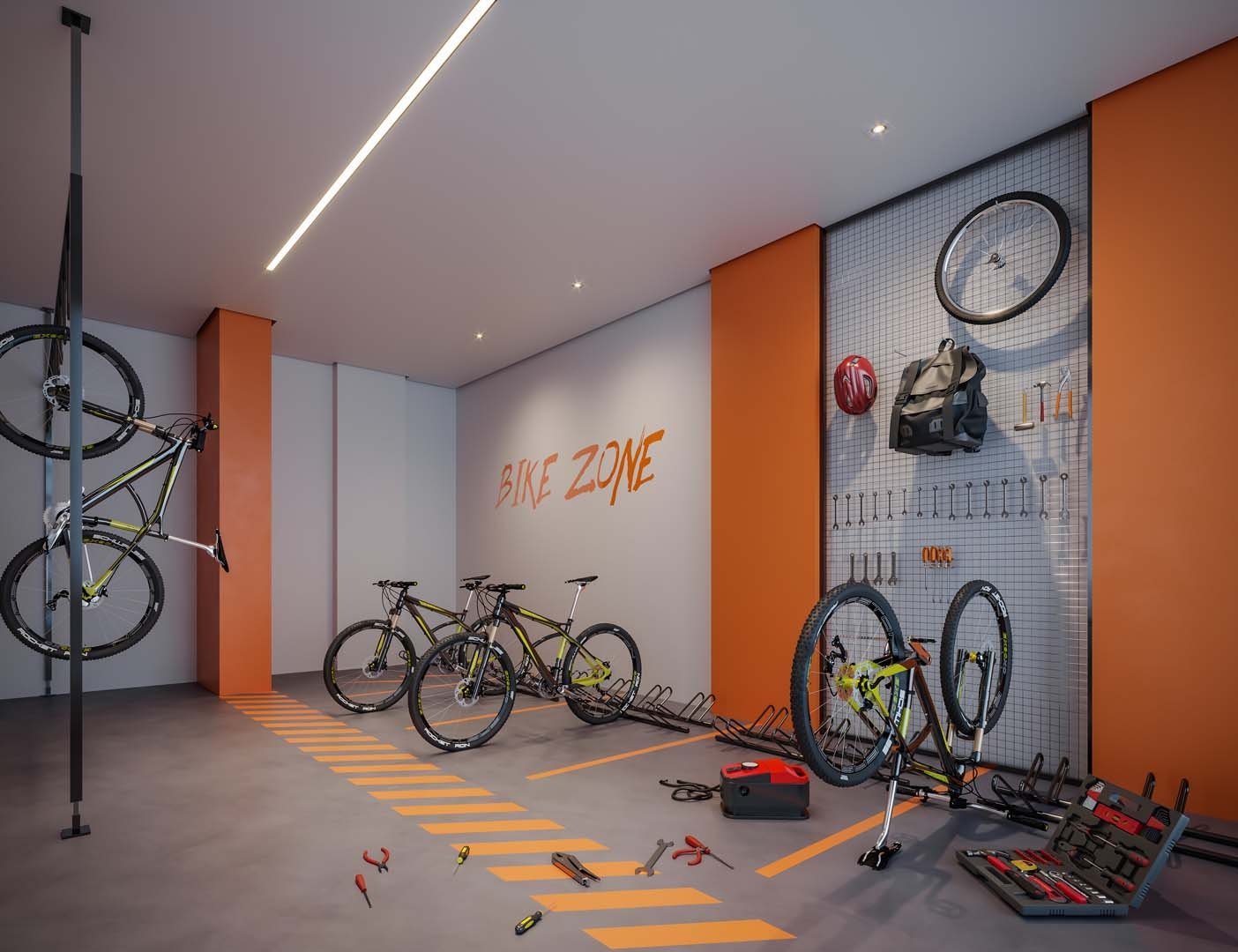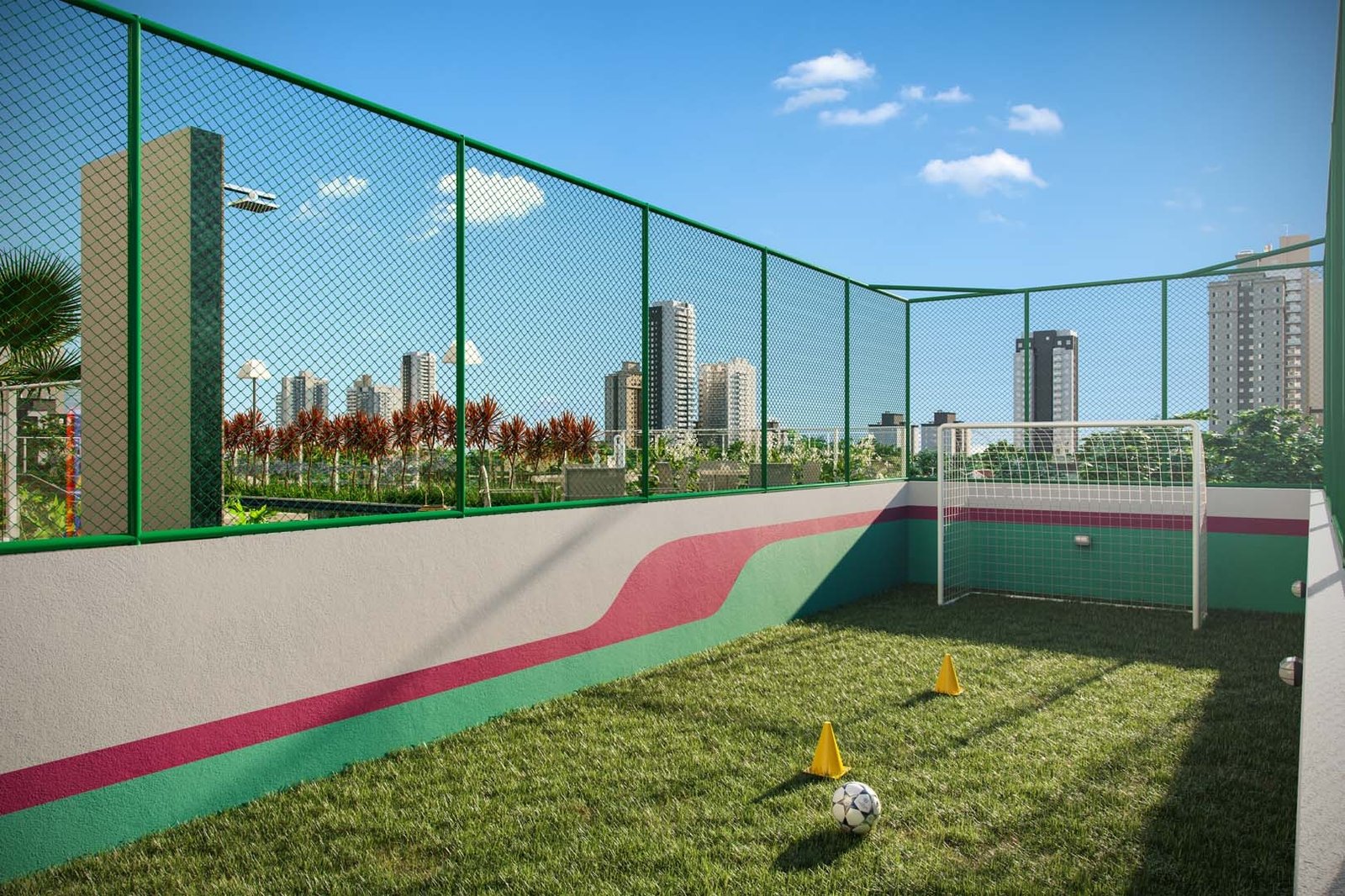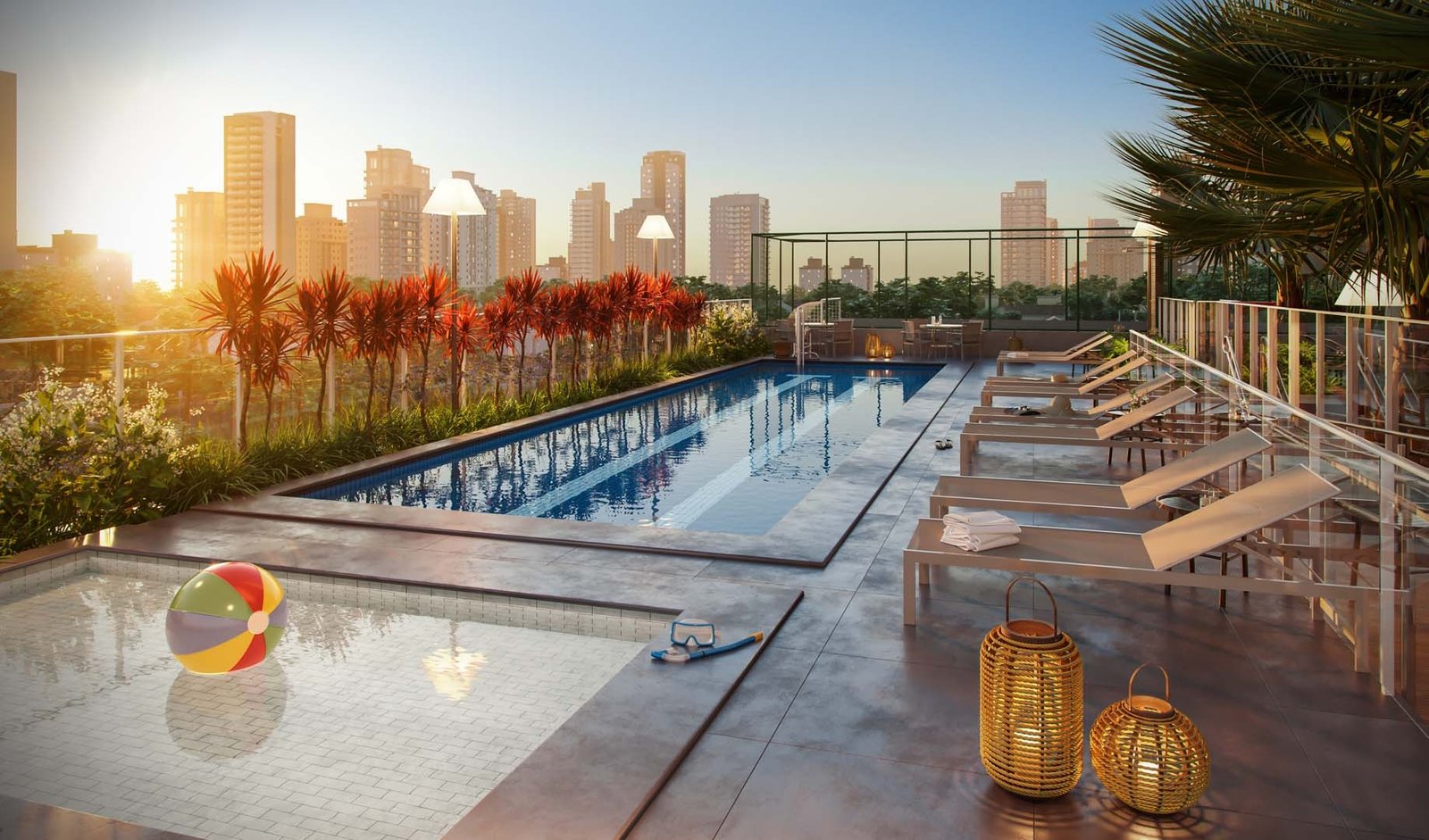 Área de lazer com piscina, brinquedoteca, espaço fitness, espaço de festas e bicicletário.